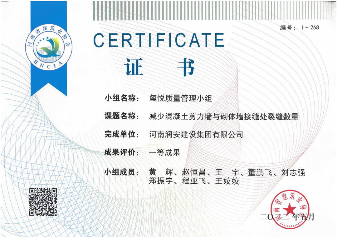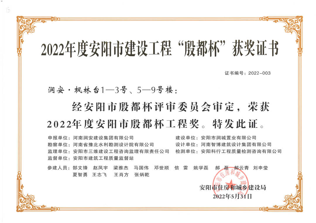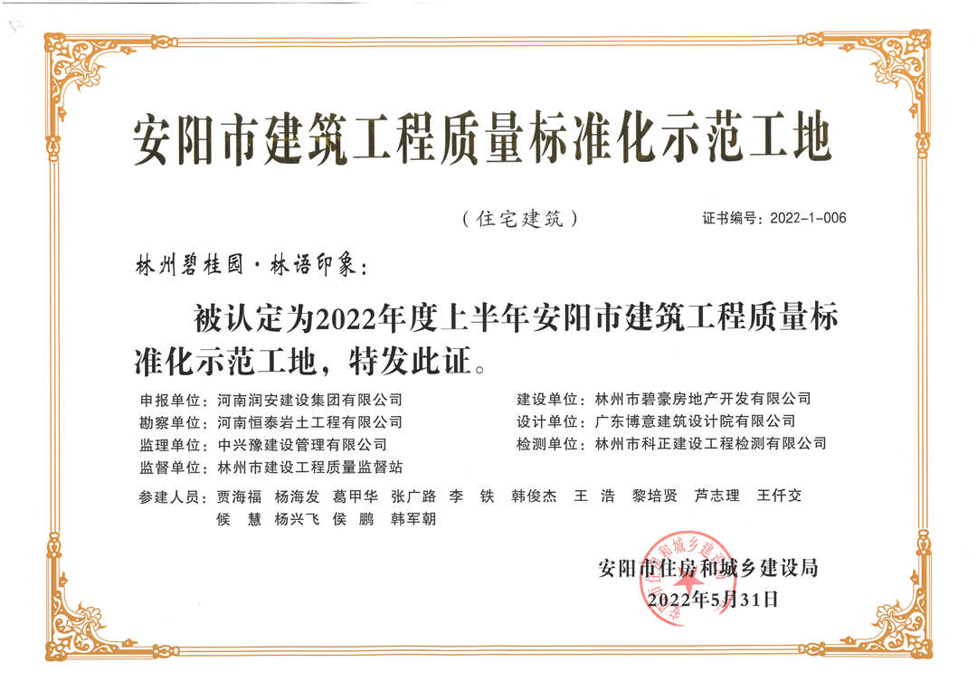 近期,集團(tuán)公司承建的多個(gè)項(xiàng)目捷報(bào)頻傳,先后有“林州碧桂園?林語(yǔ)印象項(xiàng)目”,被評(píng)為2022年上半年安陽(yáng)市建筑工程質(zhì)量標(biāo)準(zhǔn)化示范工地;潤(rùn)安楓林臺(tái)1-3、5-9號(hào)樓、林州碧桂園?天璽7號(hào)樓榮獲2022年度安陽(yáng)市殷都杯工程獎(jiǎng)。同時(shí),吾悅鴻城質(zhì)量管理小組、云頂質(zhì)量管理小組、璽悅質(zhì)量管理小組申報(bào)的三項(xiàng)課題均被河南省建筑業(yè)協(xié)會(huì)評(píng)為一等成果。