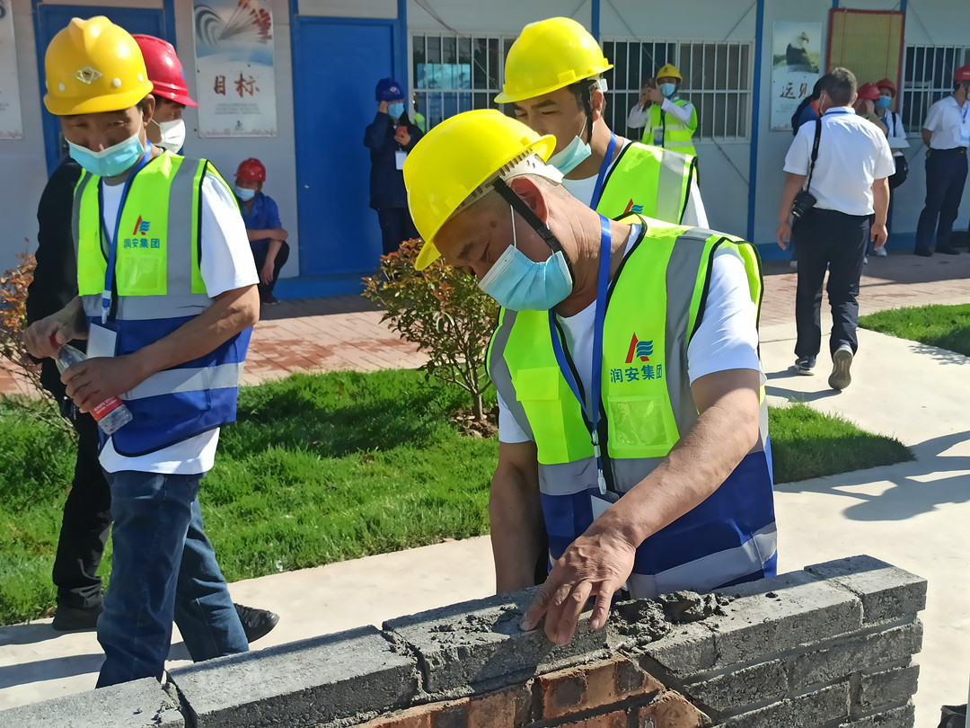 本次技能展示活動設置了鋼筋綁扎和砌筑兩個項目,我公司派遣八名職工代表參加了本次技能展示,選手們身著統(tǒng)一工作服,以嫻熟的操作技能展現(xiàn)了過硬的技術水平。砌筑工速度與質量并重,一手拿著泥刀,一手不停地一塊塊砌磚,每一道工序、每一個細節(jié)都力求做到完美,最終圓滿完成了砌筑作品《文字博物館》。鋼筋工粗中有細,在大面積作業(yè)的同時,即時進行細節(jié)處理,確保作品垂直、平整,經過一系列的復雜操作,一個完美的安陽文字博物館館徽便呈現(xiàn)在眼前。高超的技藝水平贏得了領導和現(xiàn)場觀眾的一致稱贊。